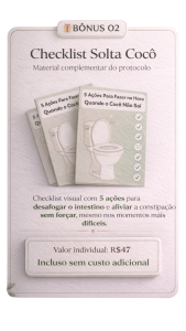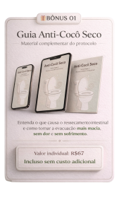 Não. O Protocolo Cocô sem Dor não envolve remédios, cápsulas, cardápios ou receitas milagrosas. É um método prático para preparar o corpo antes e na hora de ir ao banheiro, reduzindo dor e esforço.